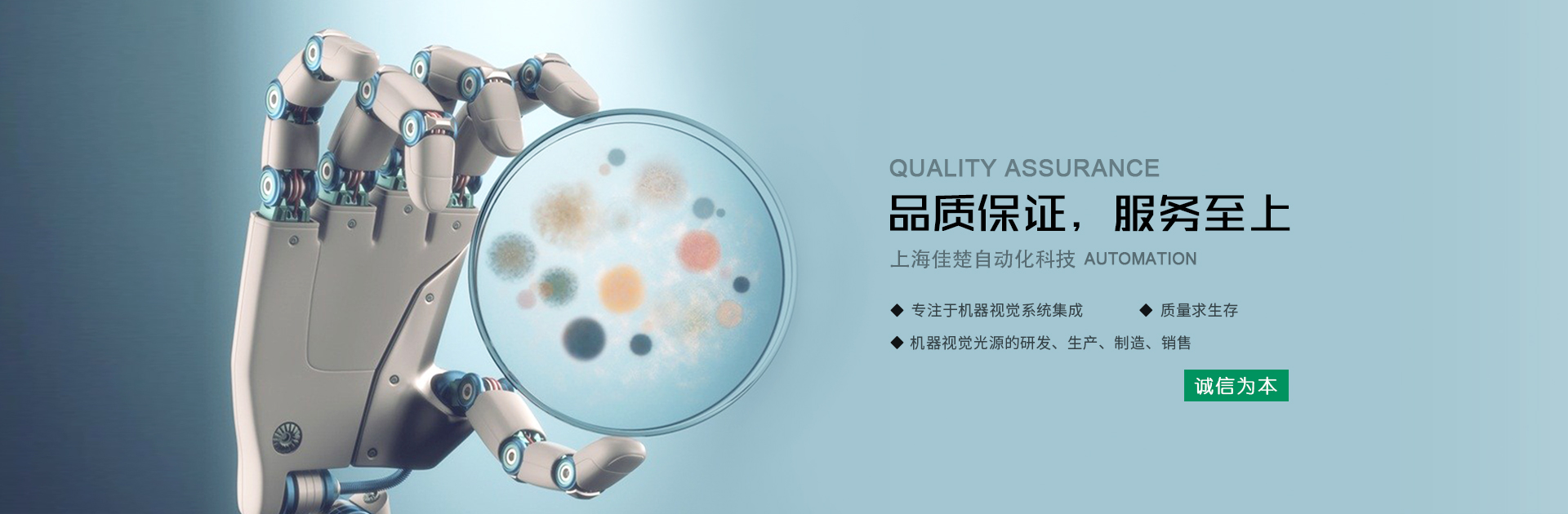 上海佳楚自動化科技有限公司(簡介:JC),自成立以來專業從事機器視覺光源的研發、生產、制造、銷售為一體的公司,專注于機器視覺系統集成。公司立足于機器視覺和工業自動化領域,打造機器視覺高端產品;在緊固件、汽車零部件、醫療器械、IC電路、精密工件加工、半導體封裝、藥品生產、包裝、食品飲料等各行業為客戶提供專業的視覺檢測解決方案。公司本著“誠信為本"和"質量求生存"的企業文化,秉承“創新一流、追求卓越、永續經營“的經營理念,以“品質第一,服務至上”作為我們的質量方針,把“誠信、負責、創新、團隊”作為公司不斷發展的追求目標,專業為客戶提供完善一流的解決方案。公司已擁有一批經驗豐富的技術研發人員,能夠快速為客戶提供優質的定制產品,JC將始終堅持公司發展的核心理念:誠實守信,堅持創新,用服務創造價值。
